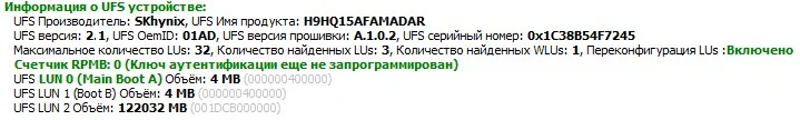 UFS версия: 2.1, UFS OemID: 01AD, UFS версия прошивки: A.1.0.2, UFS серийный номер: 0x1C38B54F7245